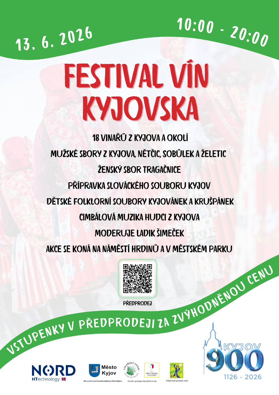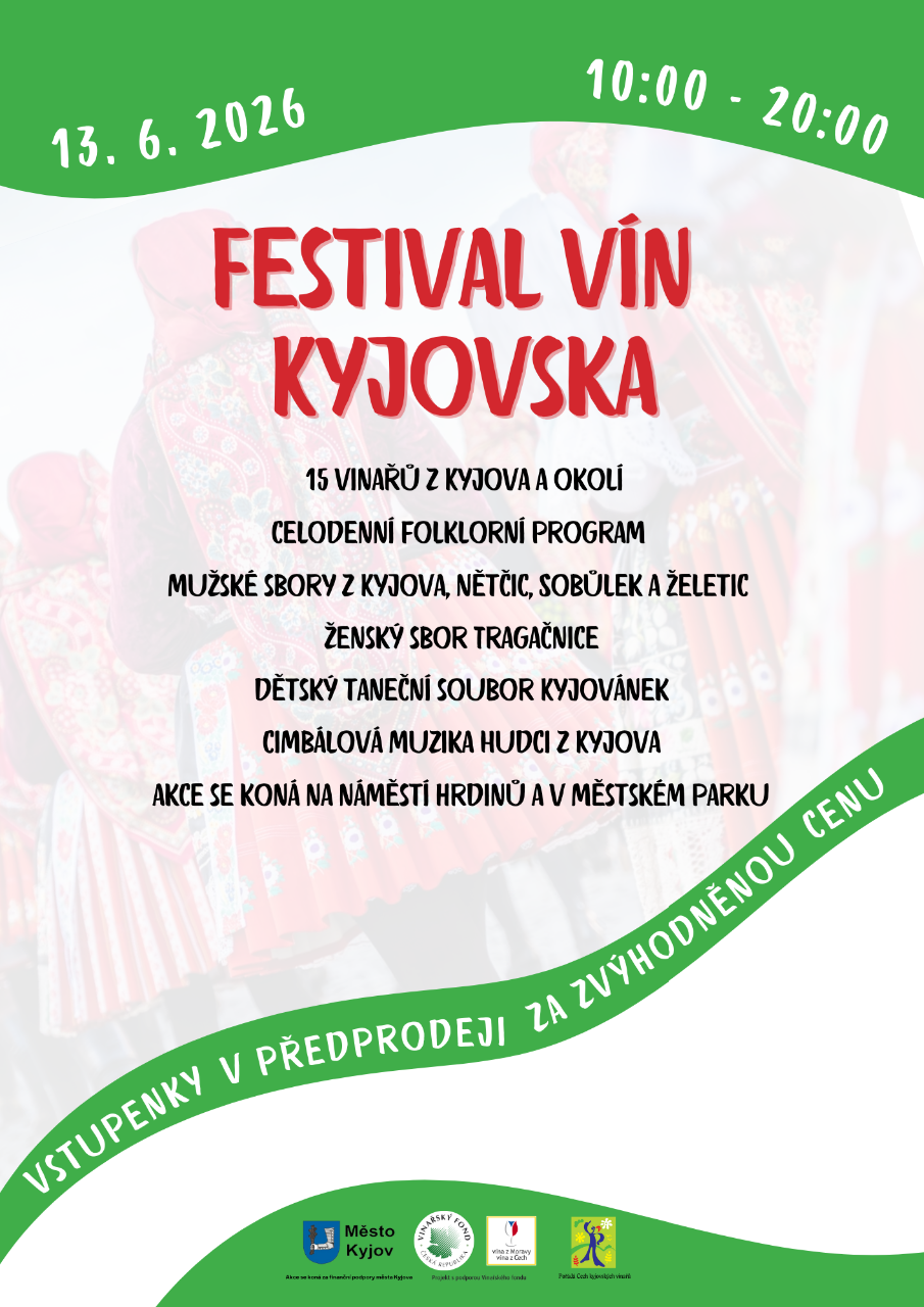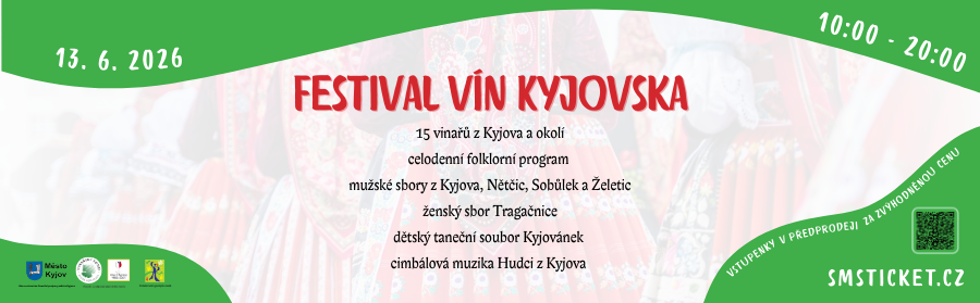 Otevřené sklepy Kyjovska se letos mění na Festival vín Kyjovska. Událost se koná na náměstí Hrdinů před Gymnáziem a v přilehlém městském parku. Začátek akce je v 10:00, na náměstí Hrdinů bude celodenní folklorní program v podobě ženských a mužských sborů, folklorního souboru Kyjovánek a cimbálové muziky Hudci z Kyjova. Nebudou chybět stánky s občerstvením a odpočinková zóna jak na náměstí, tak v parku. Vstupenky v předprodeji za zvýhodněnou cenu 300 Kč v síti Smsticket.